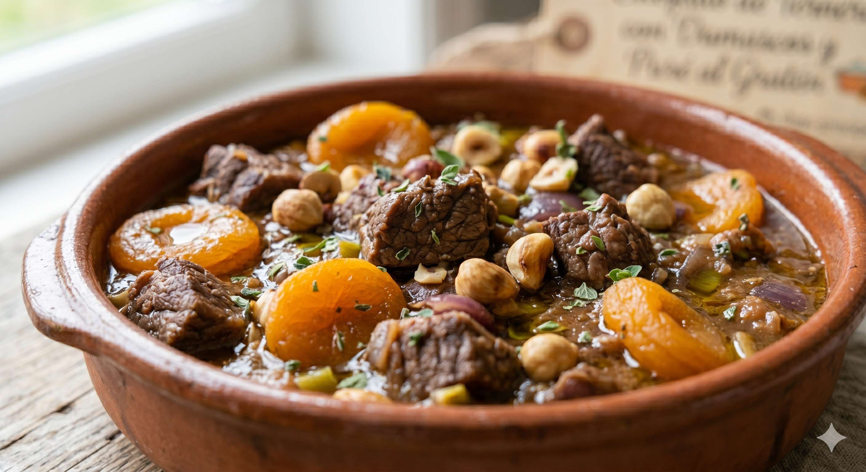 Añadir el caldo y cocinar a fuego muy lento durante 3 horas. En los últimos 5 minutos de cocción, incorporar los damascos y las avellanas.