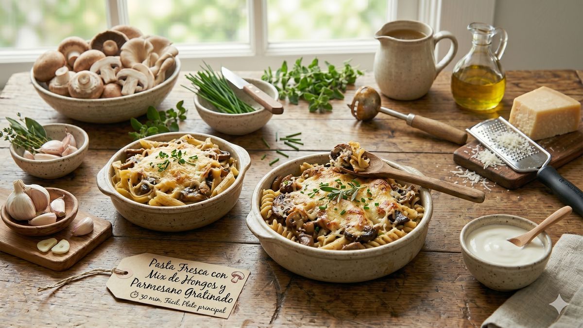 Pasta Fresca con Mix de Hongos y Parmesano Gratinado