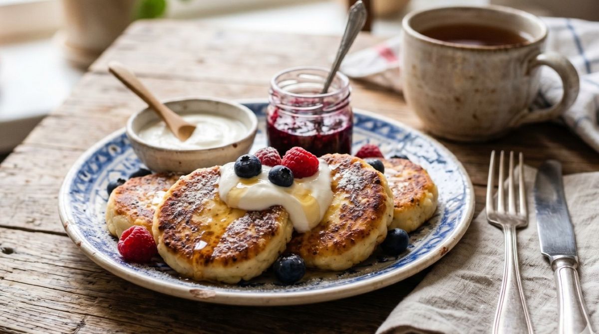 Cocción lenta: Calentar una sartén con manteca a fuego medio-bajo. Dorar los syrniki lentamente por ambos lados para que el centro se cocine correctamente sin que el azúcar de la superficie se queme.